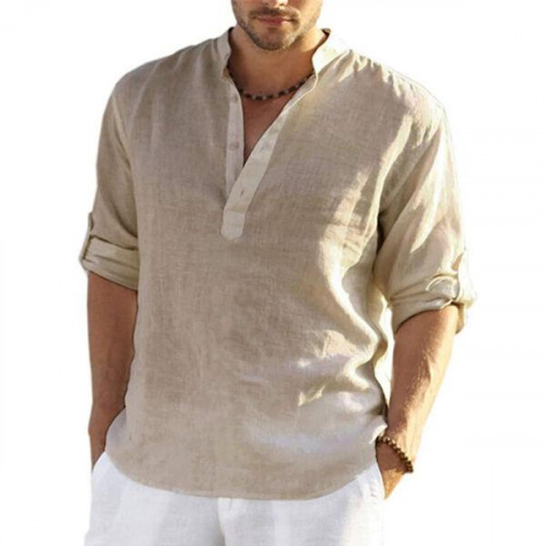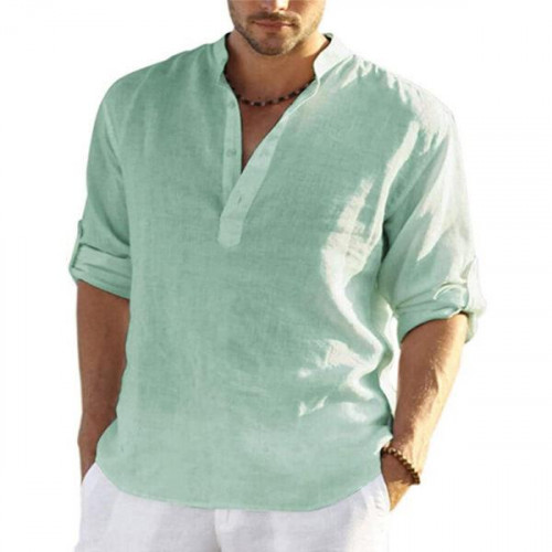 Men Long Sleeve Linen Shirt Tops Blouse Dress Shirt Solid Color Casual Loose