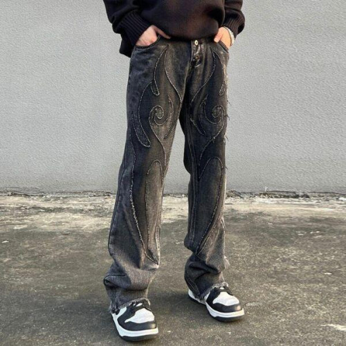 Men Patchwork Embroidery Casual Denim Pants Elastic Waist Baggy Jeans Trousers